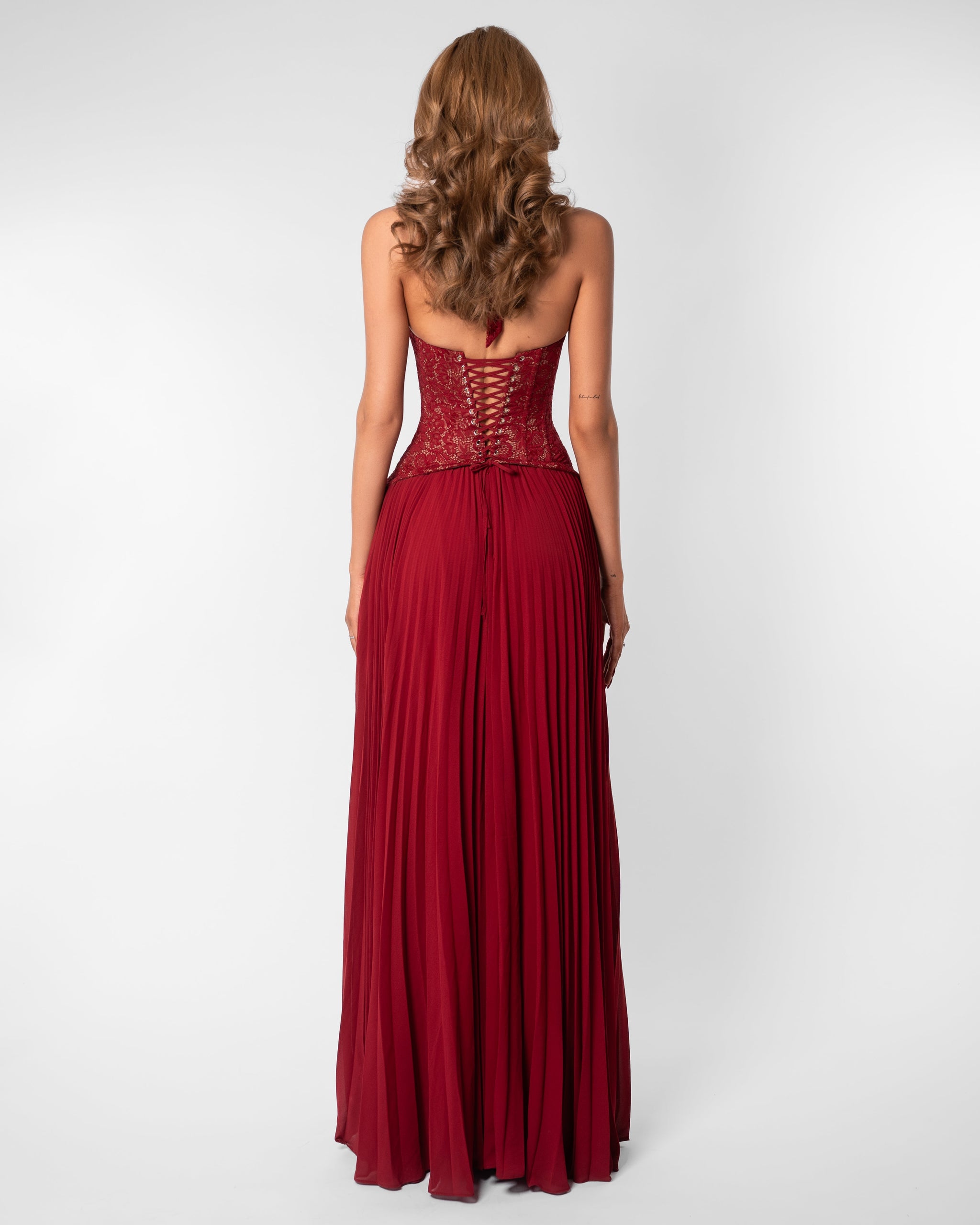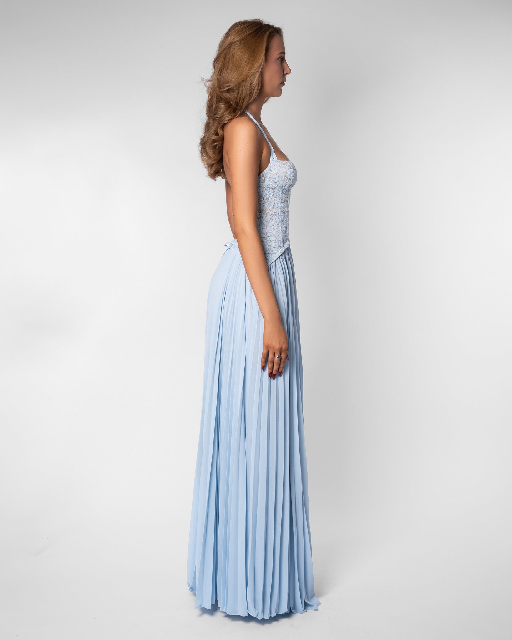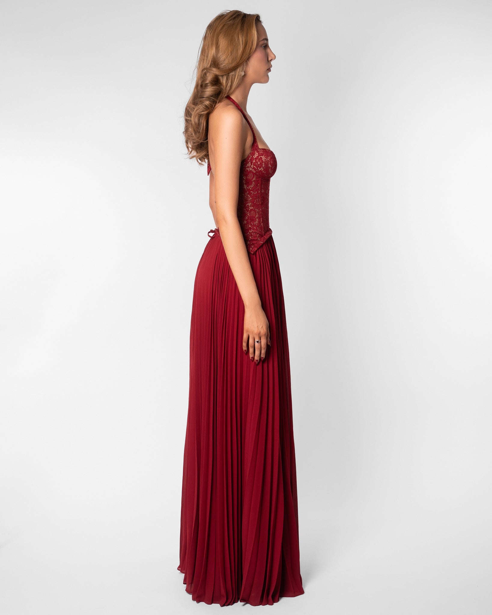 The Nathalie Maxi Dress is designed for the woman who loves a sensual, modern, and refined look. The semi-transparent floral lace bodice with corset-like structure elegantly shapes your silhouette, while the sweetheart neckline with halter strap subtly accentuates the décolletage. The combination of a fitted top and a flowing, pleated skirt creates a feminine and luxurious appearance that moves effortlessly with you.
